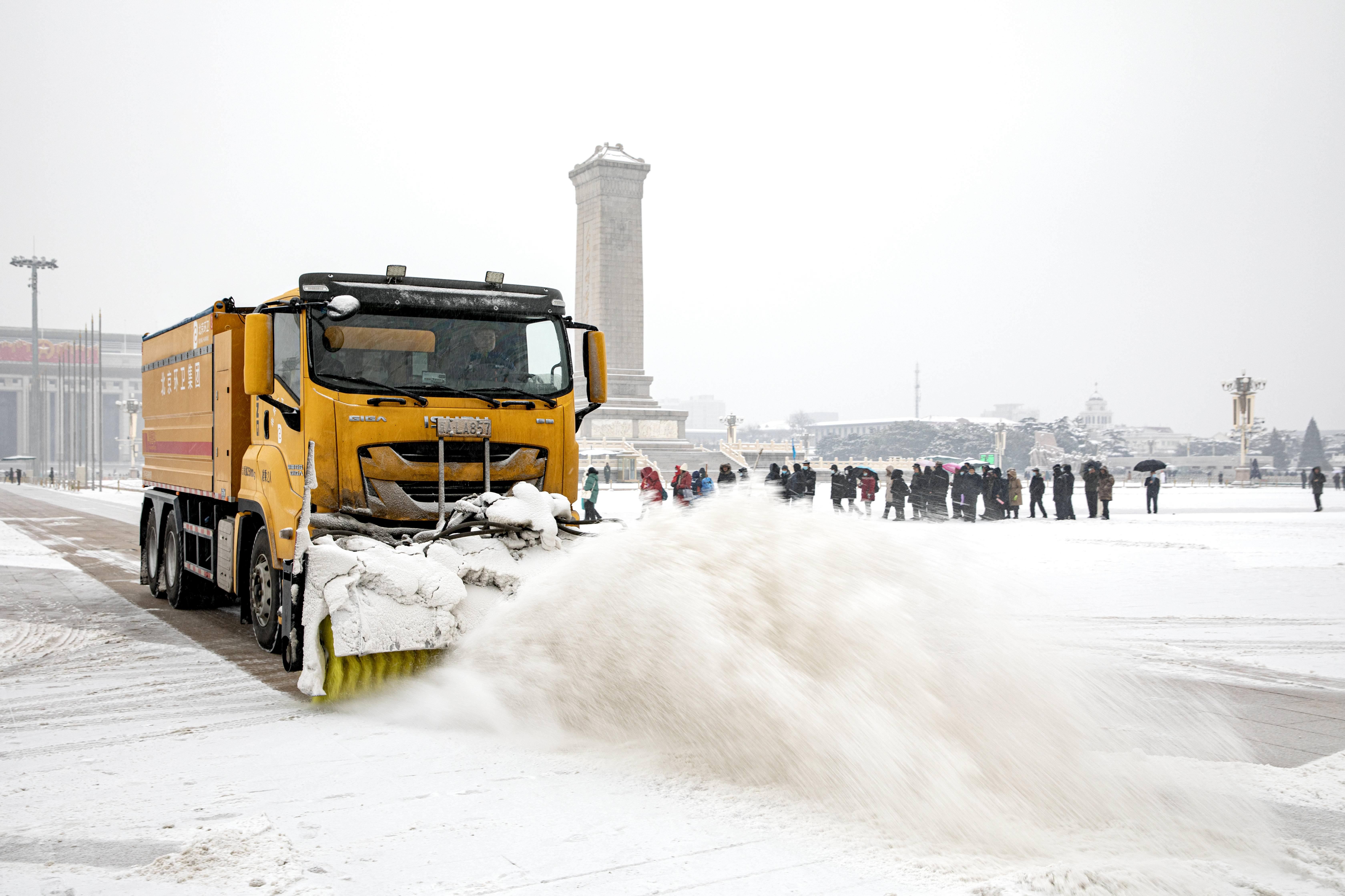 北京机扫公司职工在天安门广场进行“米”字型除雪,同时注意保留雪景(丁丹摄)