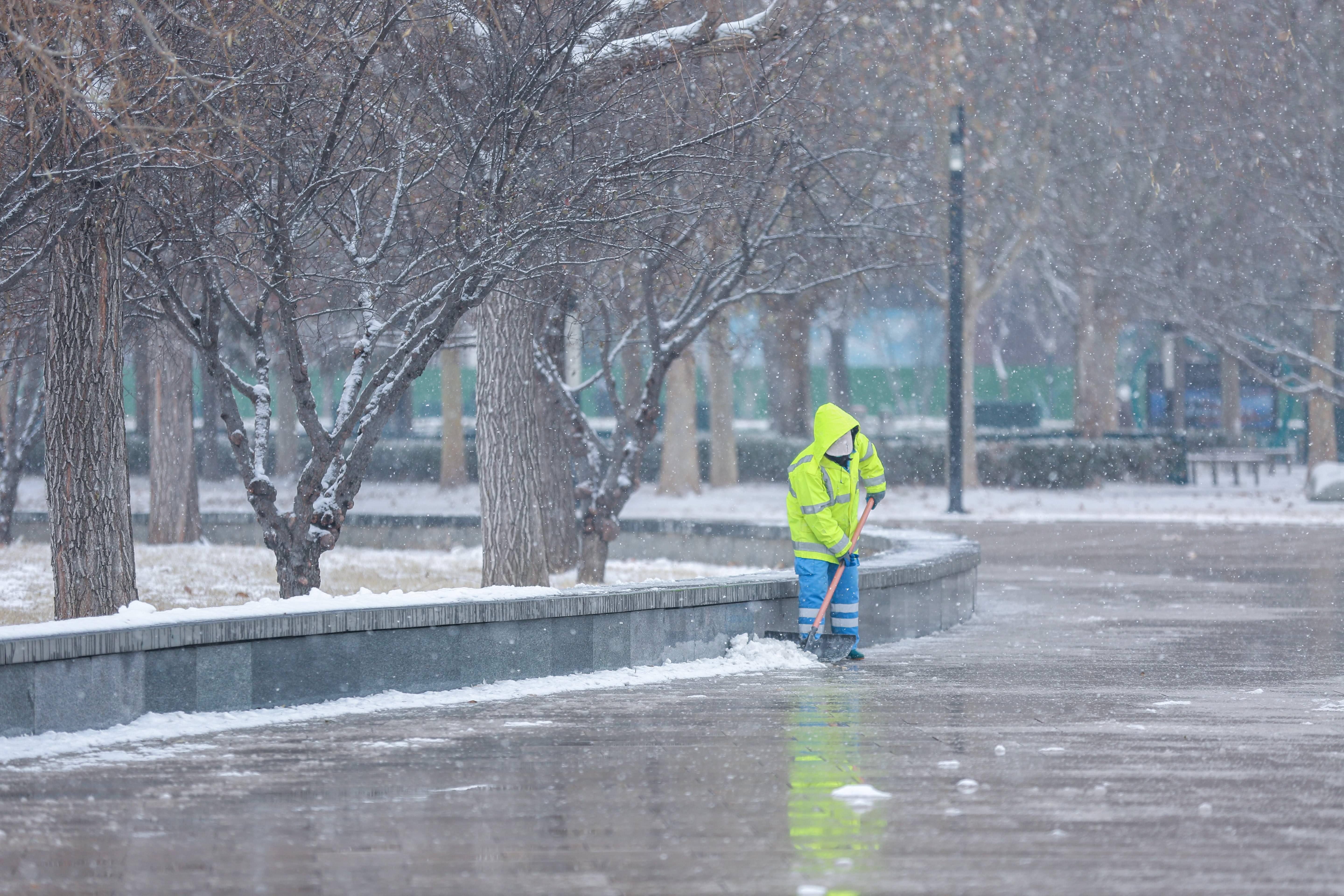 环服公司职工在朝阳区营盘沟路开展人工推雪作业(马晓洁摄)