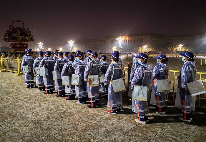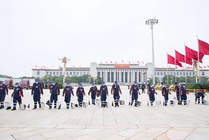 9月30日凌晨5时,天空下起小雨。全体服务保障人员冒雨作业,47名保洁员列队进入广场戒严区,配合作业车辆集中清理。在升旗仪式结束后,按照随清随撤工作要求,保障人员快节奏高效率、仅用时15分钟就完成广场地面清扫保洁工作。