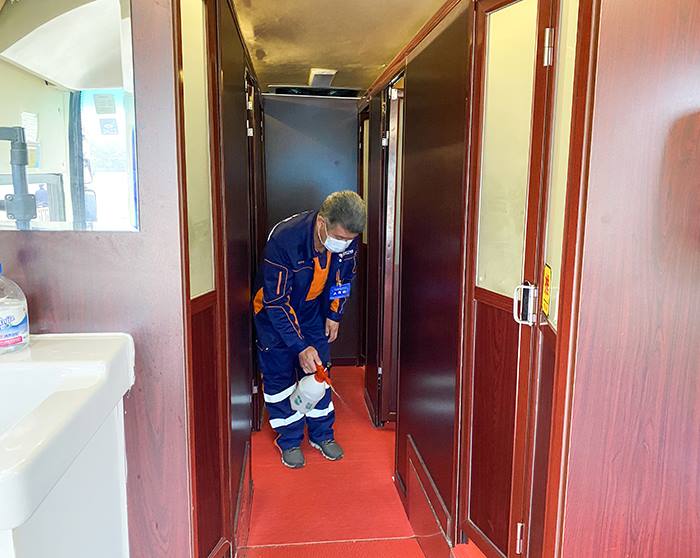 为了满足现场观众及各方工作人员的如厕需求,北京机扫公司装备服务中心时传祥班组提前完成篷帐厕所的搭建及拖挂卫生间入位、摆放工作,对卫生间进行了细致维护和全面保洁,配齐消毒洗手液、纸巾等物品,确保卫生间各项功能运转正常,同时做好防疫消杀工作。