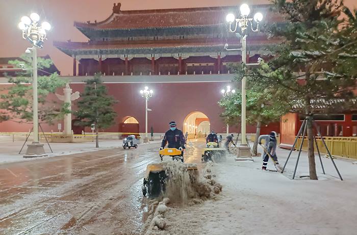 11月7日清晨7时30分许,北京机扫公司街巷服务中心职工清理颐和园景区内积雪,确保游客安全游览