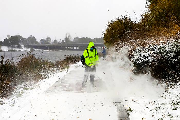11月7日清晨8时,火狐绿谷公司水域作业中心保洁员利用吹雪机对洳河河堤步道开展地毯式清理,以便市民欣赏冬日河景