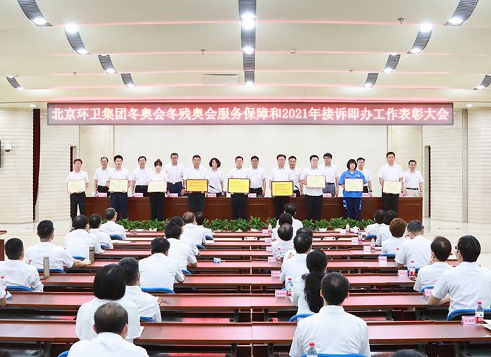 会上宣读了冬奥会冬残奥会服务保障和2021年接诉即办工作表彰决定。集团生产运营部、北京机扫公司、固废物流公司、南宫生物质公司、北火狐境河北分公司5家单位被授予冬奥会冬残奥会服务保障工作突出贡献集体荣誉称号;集团党委宣传部、监察专员办公室等16家单位被授予优秀集体荣誉称号;刘亚淘等168名同志被授予先进个人荣誉称号。北京机扫公司、通州火狐公司、固废处理公司阿苏卫填埋场3家单位被授予集团2021年接诉即办工作先进集体荣誉称号;田泽宇等7名同志被授予先进个人荣誉称号。集团领导分别为受到表彰的突出贡献集体、优秀集体和先进个人代表颁奖。